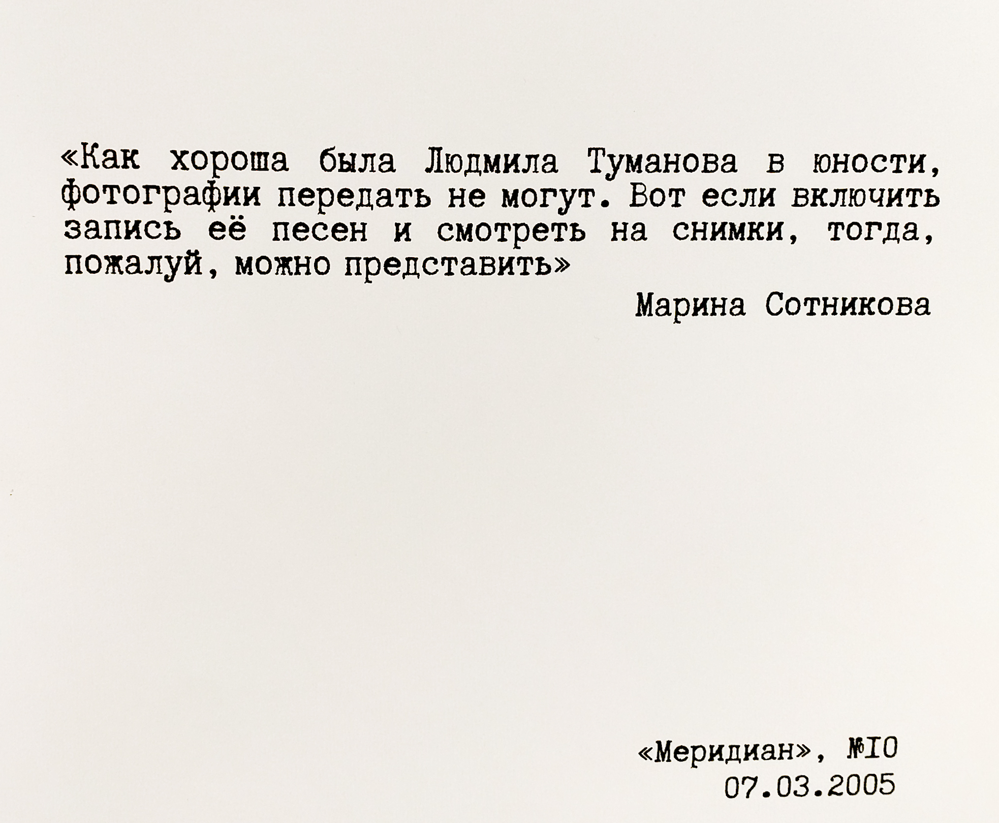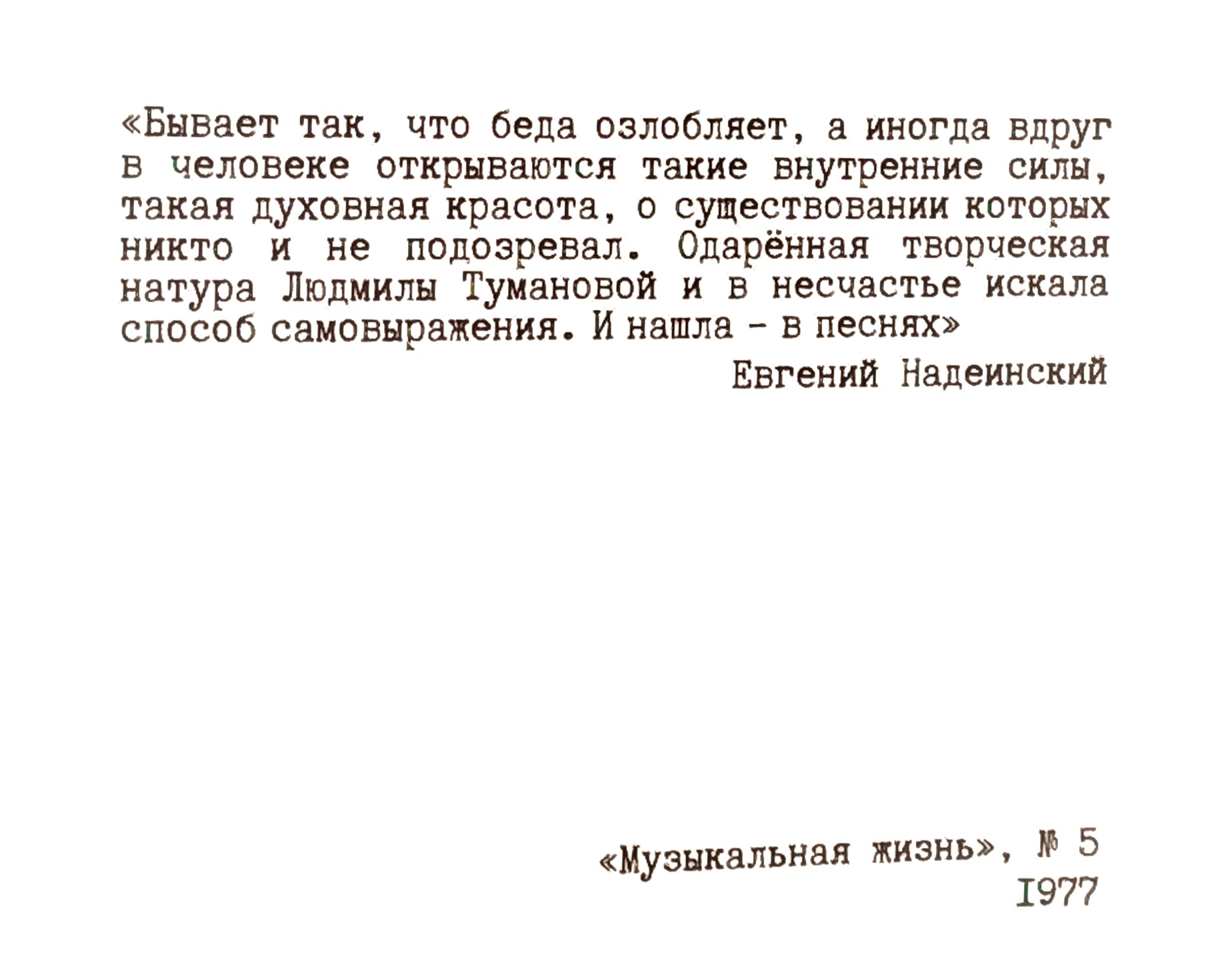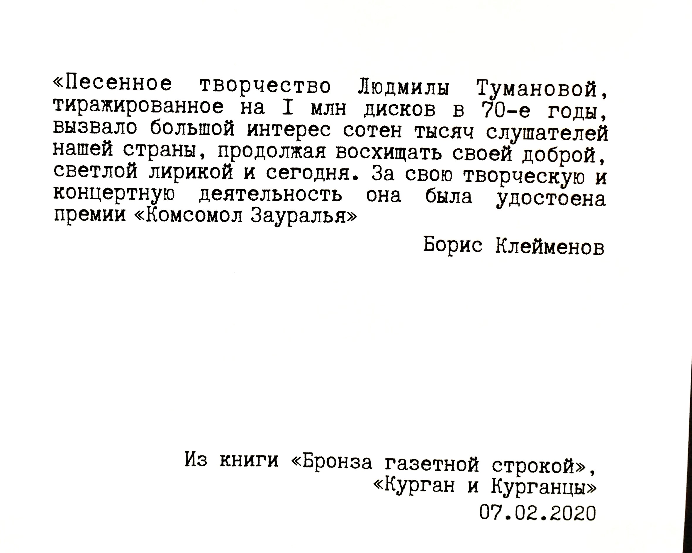 Директор Дома народного творчества Ирина Потапова (кстати, журналист, бывший редактор Кетовской районной газеты) напомнила, что мелодичные песни Людмилы Тумановой звучали практически в каждом доме, наполняя сердца людей безбрежной нежностью, искренней добротой и теплом. Тысячи писем поклонников приходили на её адрес со всей страны.